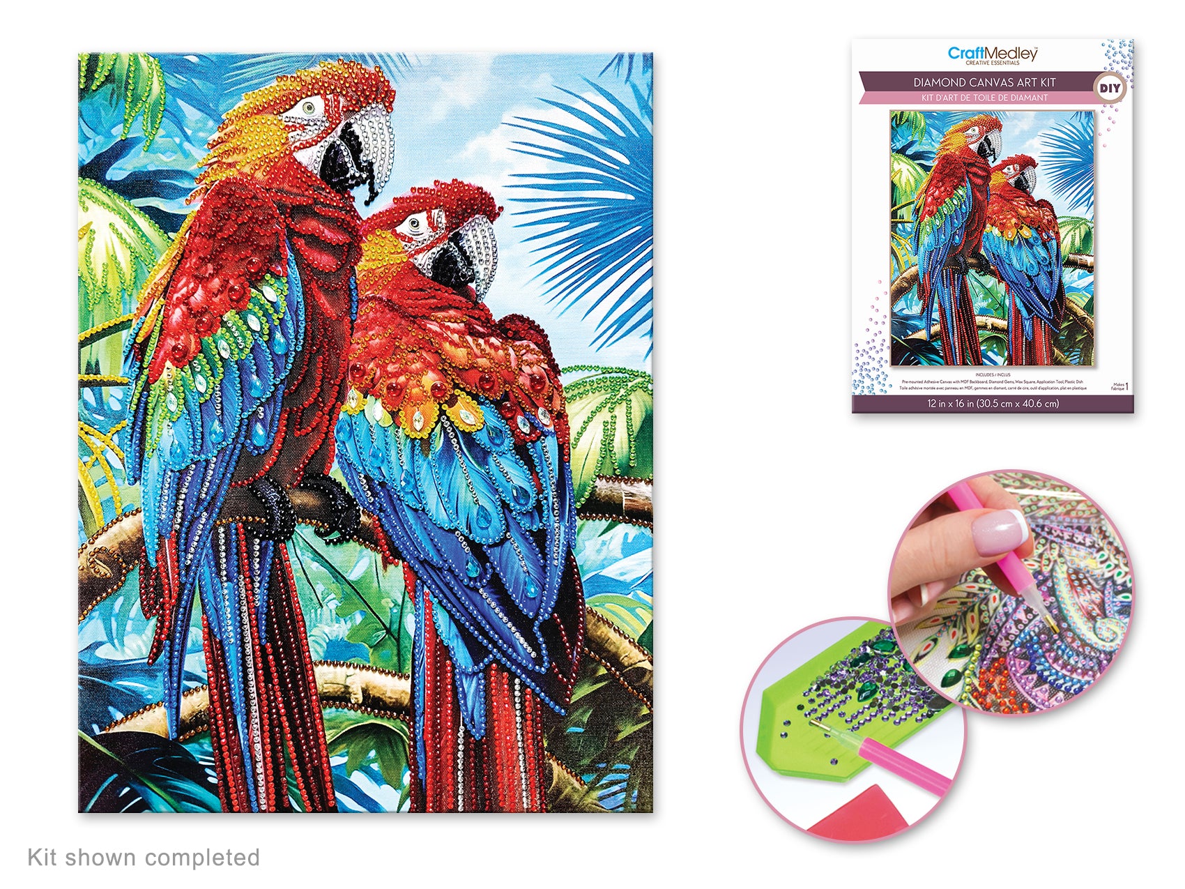 Craft Medley Kit: Diamond Painting Art Kit 12"x16" w/Gems+Tool+Tray P) Parrots